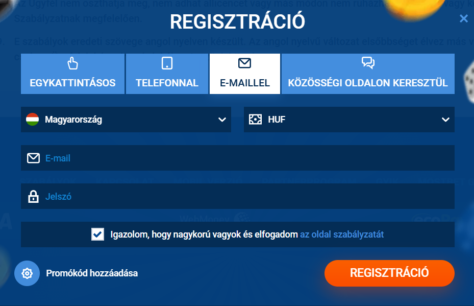 Ez a leggyorsabb megoldás azok számára, akik azonnal el szeretnék kezdeni a játékot. A felhasználó kiválasztja az országot és a pénznemet, majd a rendszer automatikusan generál egy felhasználónevet és jelszót.